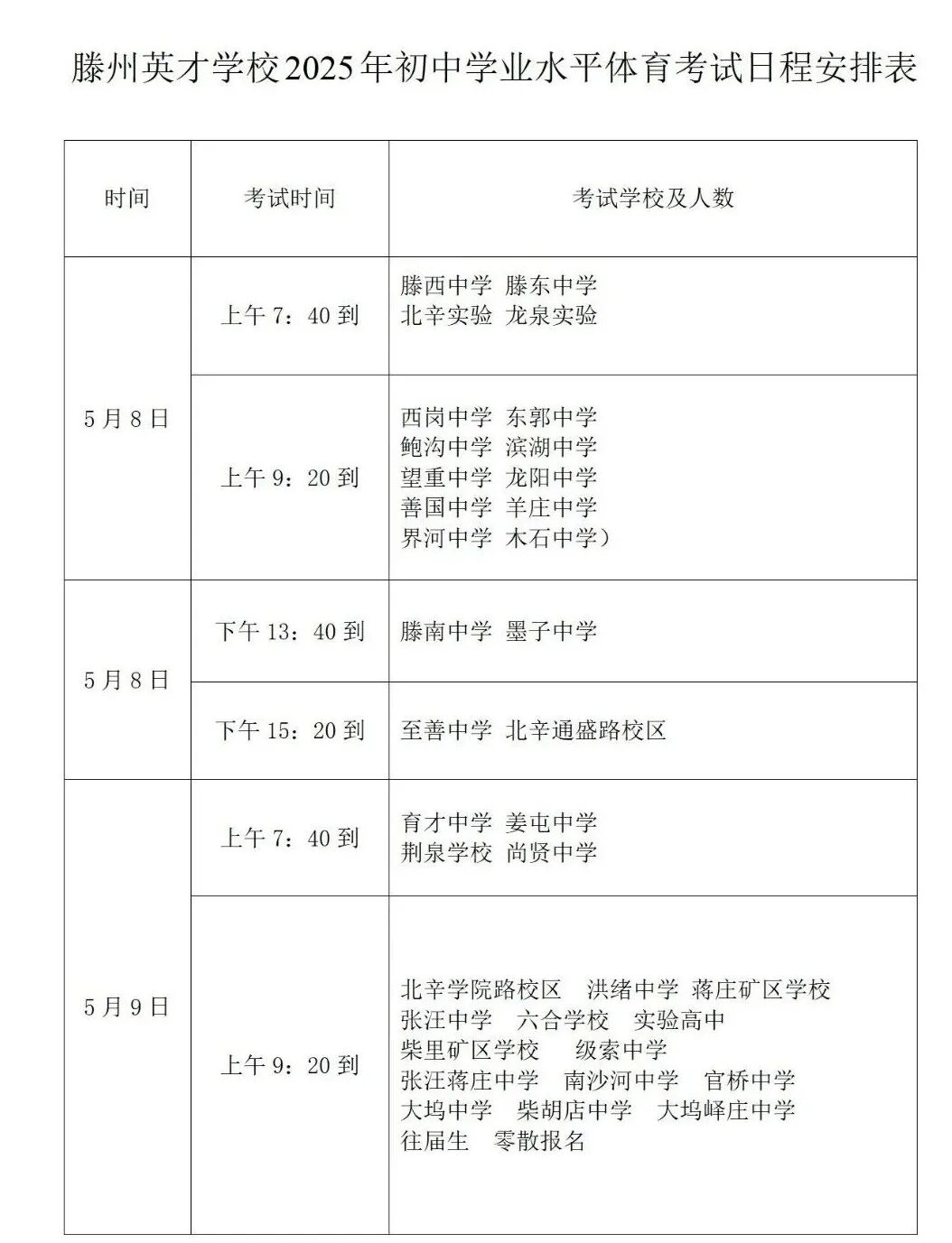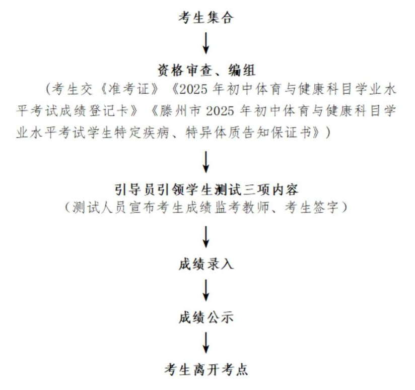1、考生须持《准考证》《体育考试成绩登记卡》《学生特定疾病、特异体质告知保证书》参加考试。 2、《体育考试成绩登记卡》滕州应届考生已发至初中学校;滕州零散报名及外区市考生,请于5月3日上午11:00前来英才学校领取。(英才学校南门右侧尚善会堂)。 3、考试时间:5月8日-9日上午 4、考试地点:滕州英才学校 5、缓考考生考试时间电话通知。 6、因天气等原因无法如期进行考试,考试不顺延,考试时间另行通知。 7、请考生务必按照安排的时间参加考试。 8、咨询电话: 张老师15318088739(微信同号) 吕老师18663205097(微信同号) 王老师19063218059(微信同号) 9、所有考生一律从英才学校北门进,初中学校大巴车可进校,个人私家车禁止入内。 滕州英才学校2025年初中学业水平体育考试日程安排表 滕州英才学校2025年初中学业水平考试流程示意图